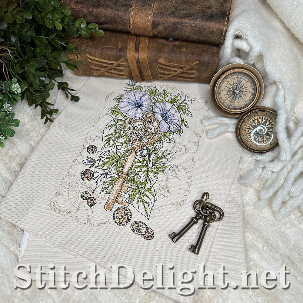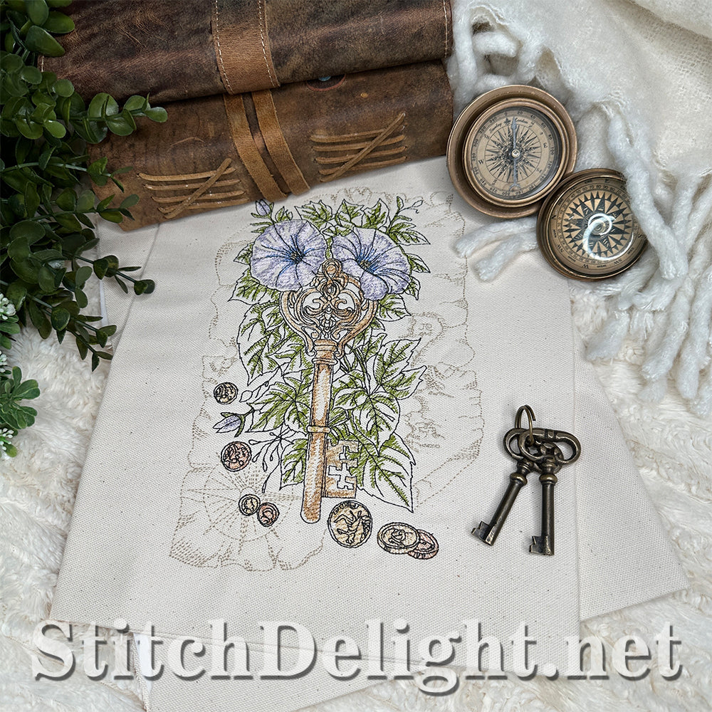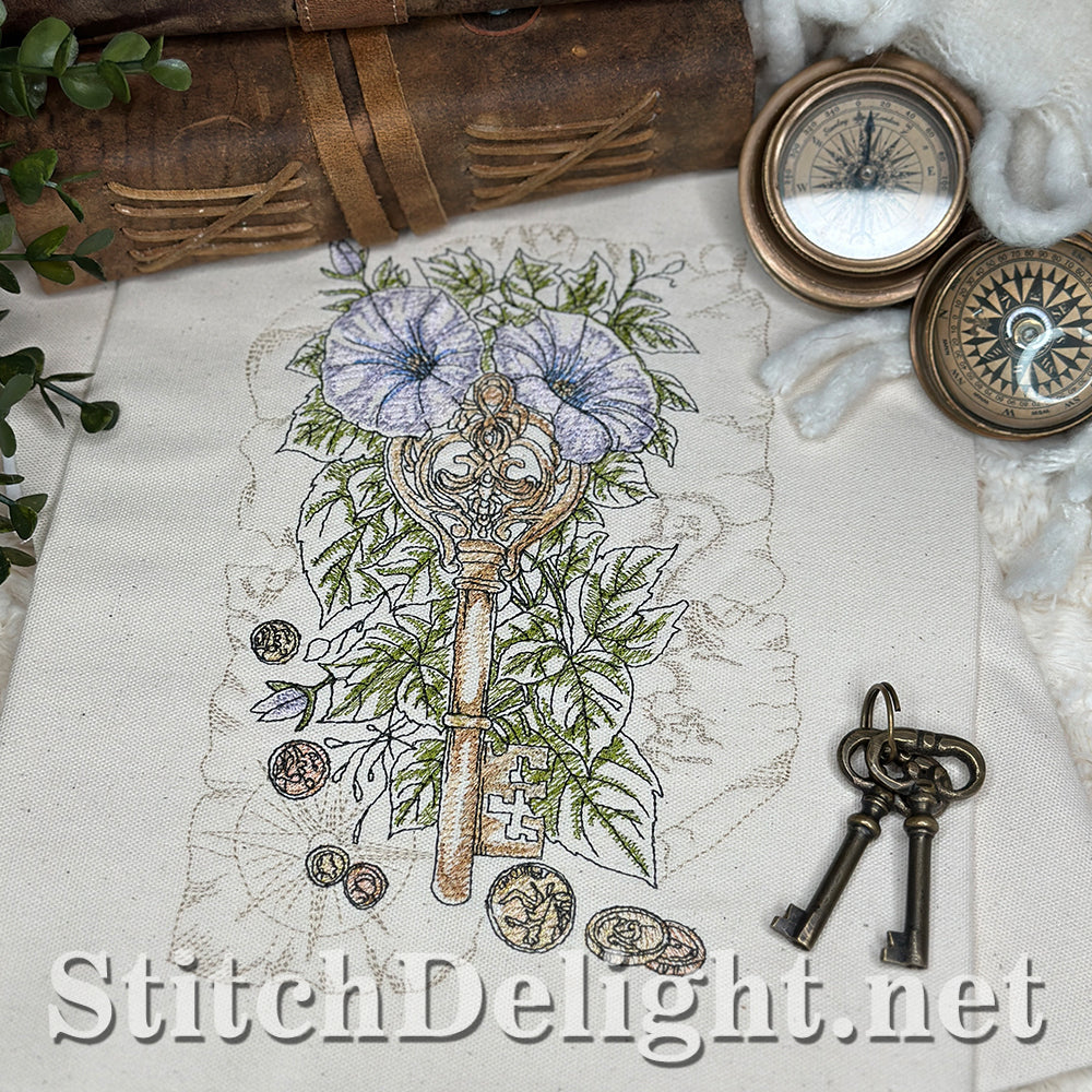Embark on a fun treasure hunt with us. With gold and copper coins (yes we stitch these in metallic thread) and glorious morning glory vines, in a vintage and adventurous setting.