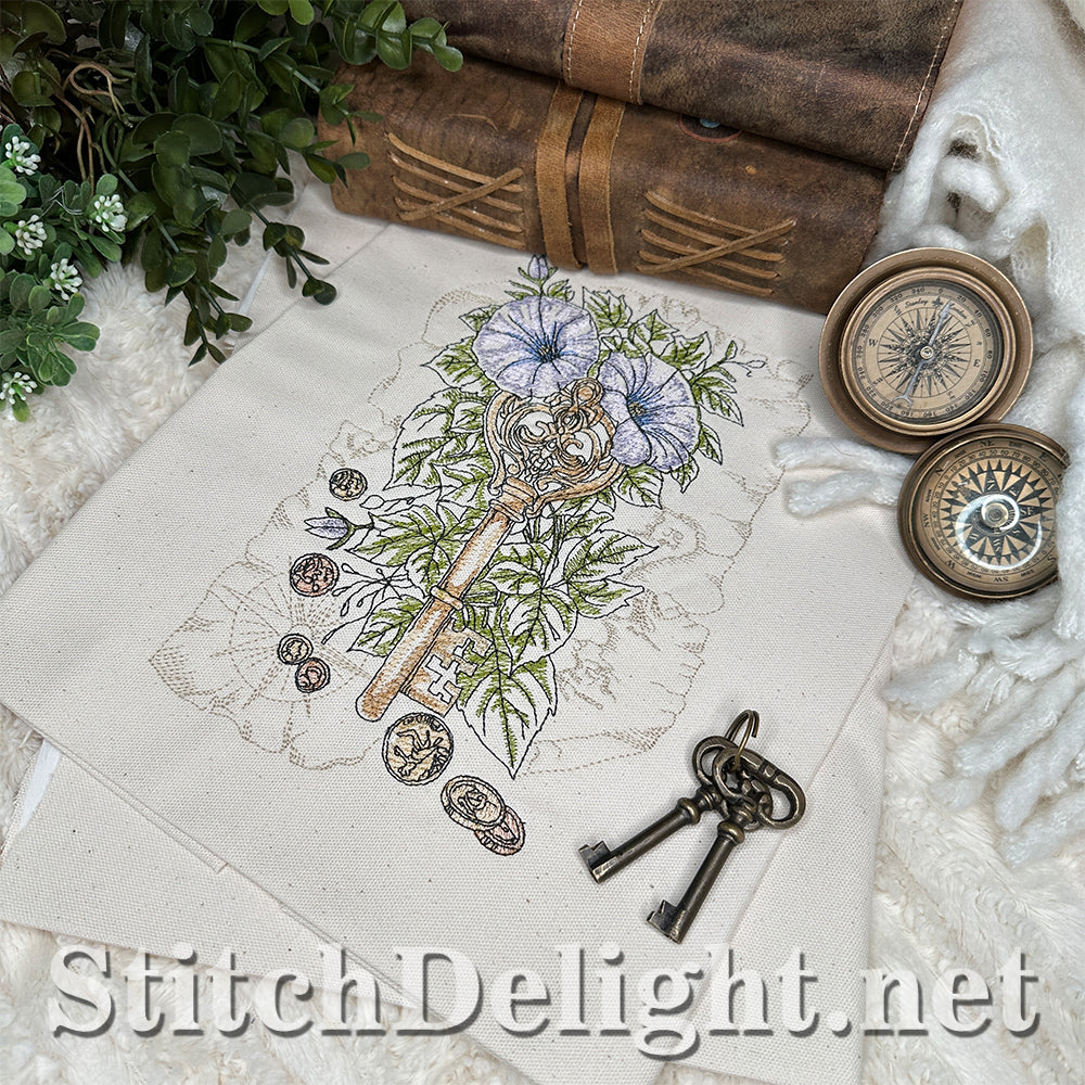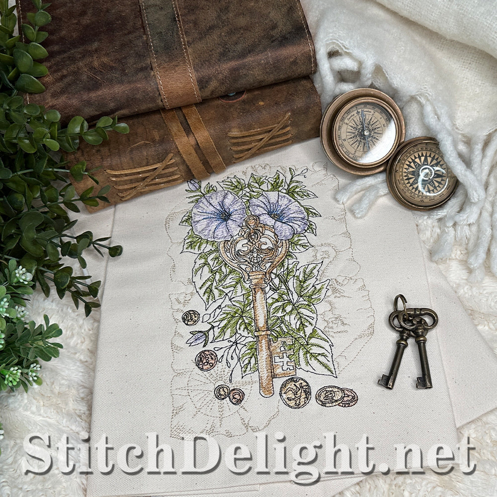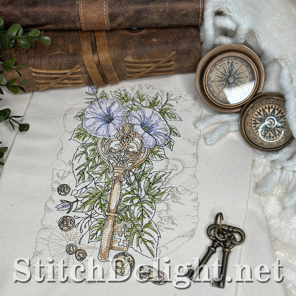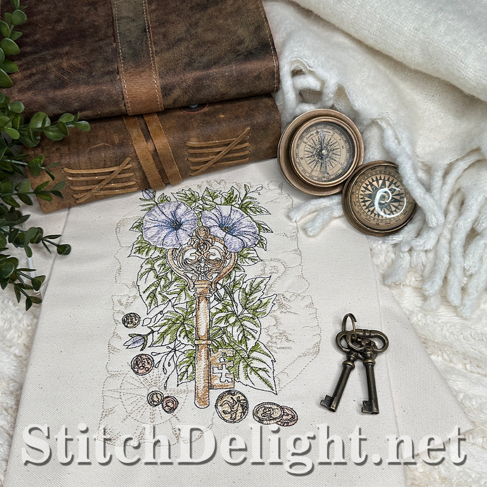 Embark on a fun treasure hunt with us. With gold and copper coins (yes we stitch these in metallic thread) and glorious morning glory vines, in a vintage and adventurous setting.