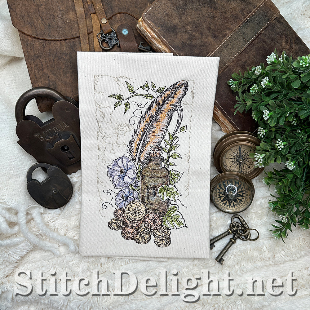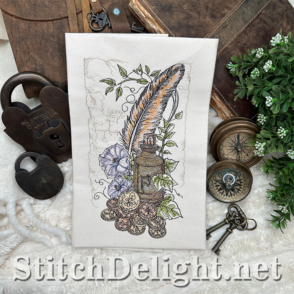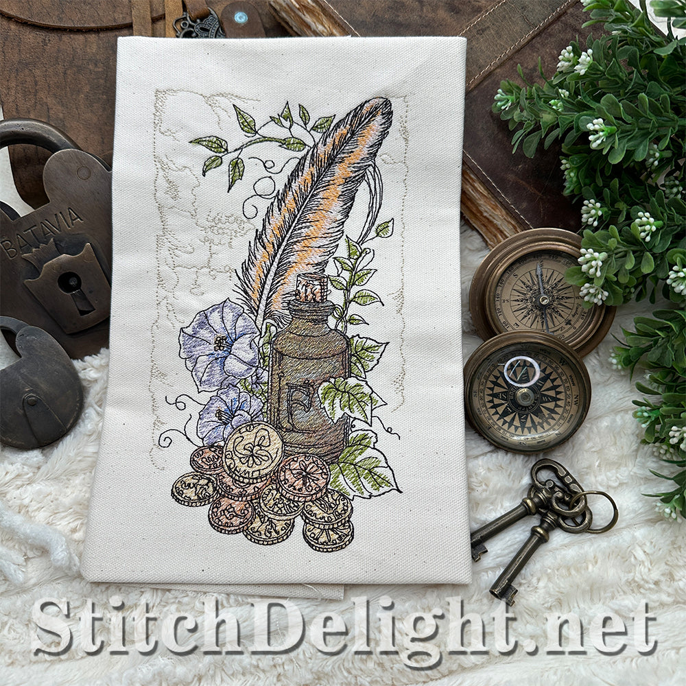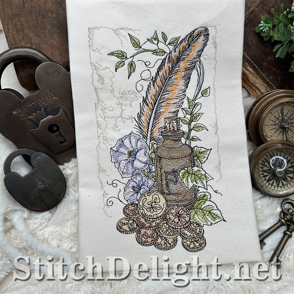 Embark on a fun treasure hunt with us. With gold and copper coins (yes we stitch these in metallic thread) and glorious morning glory vines, in a vintage and adventurous setting.