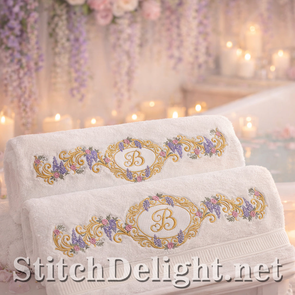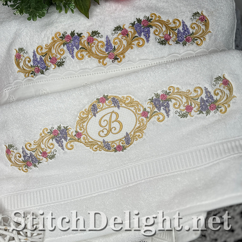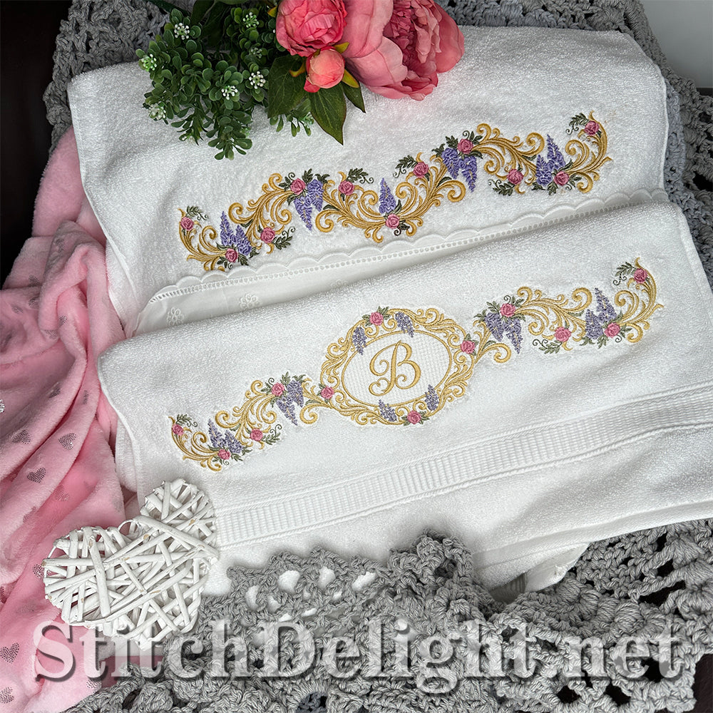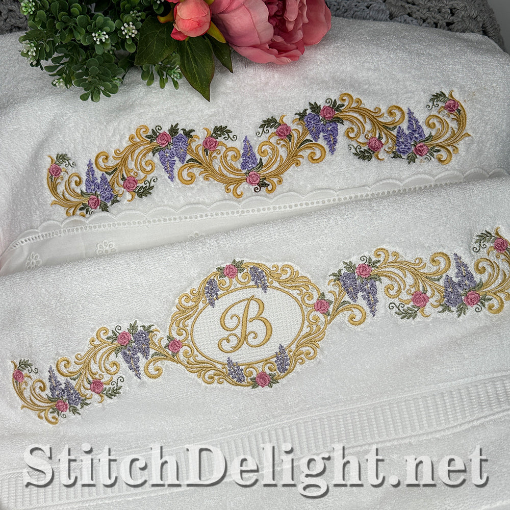 Bridgerton Style borders for linen, towels, sheets, pillow cases, quilts or why not stitch one of the smaller ones on a bathrobe and matching on the bath slippers. A wide variety of sizes included and bonus designs all with knockdown stitch for stitching on to towels or bathrobes.