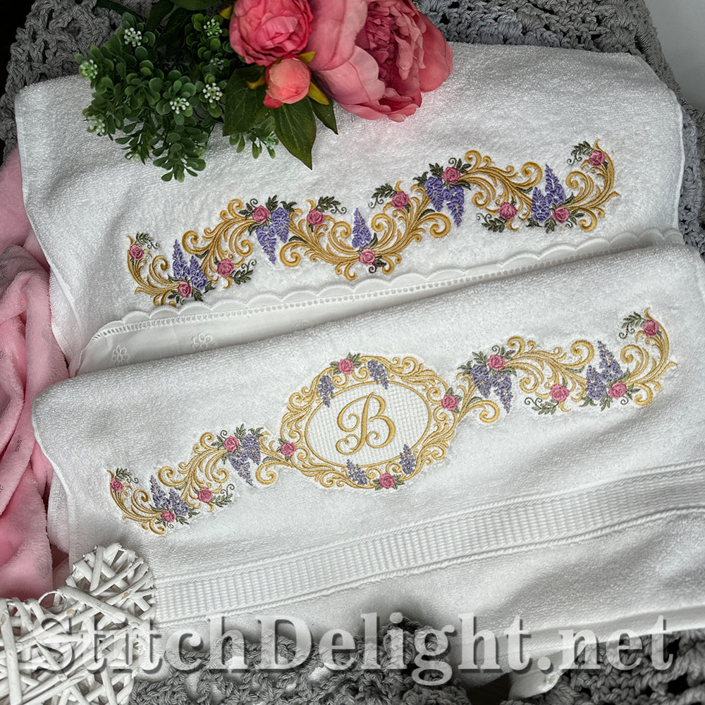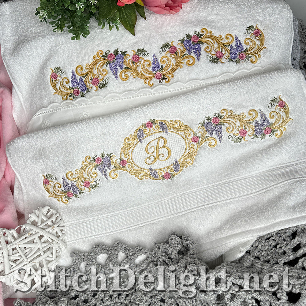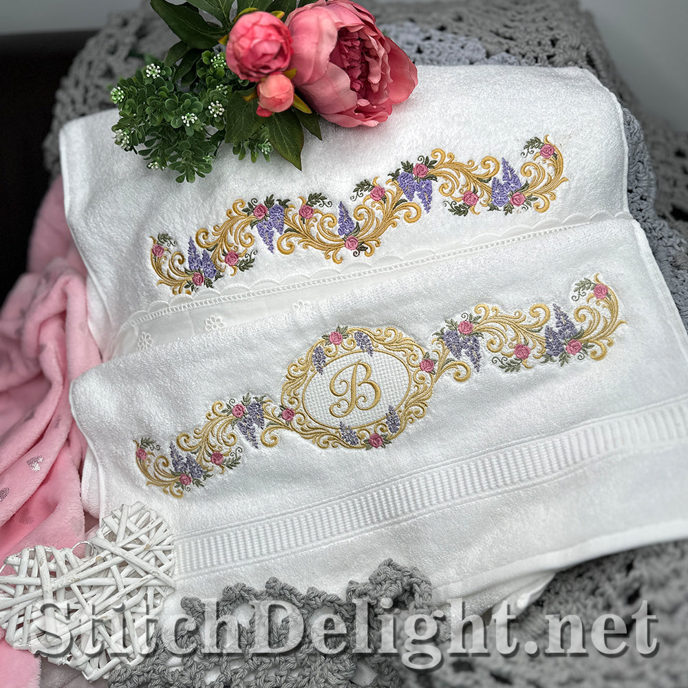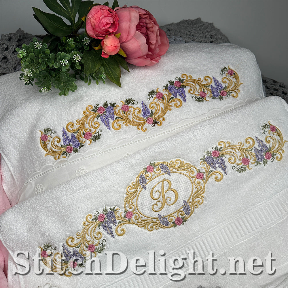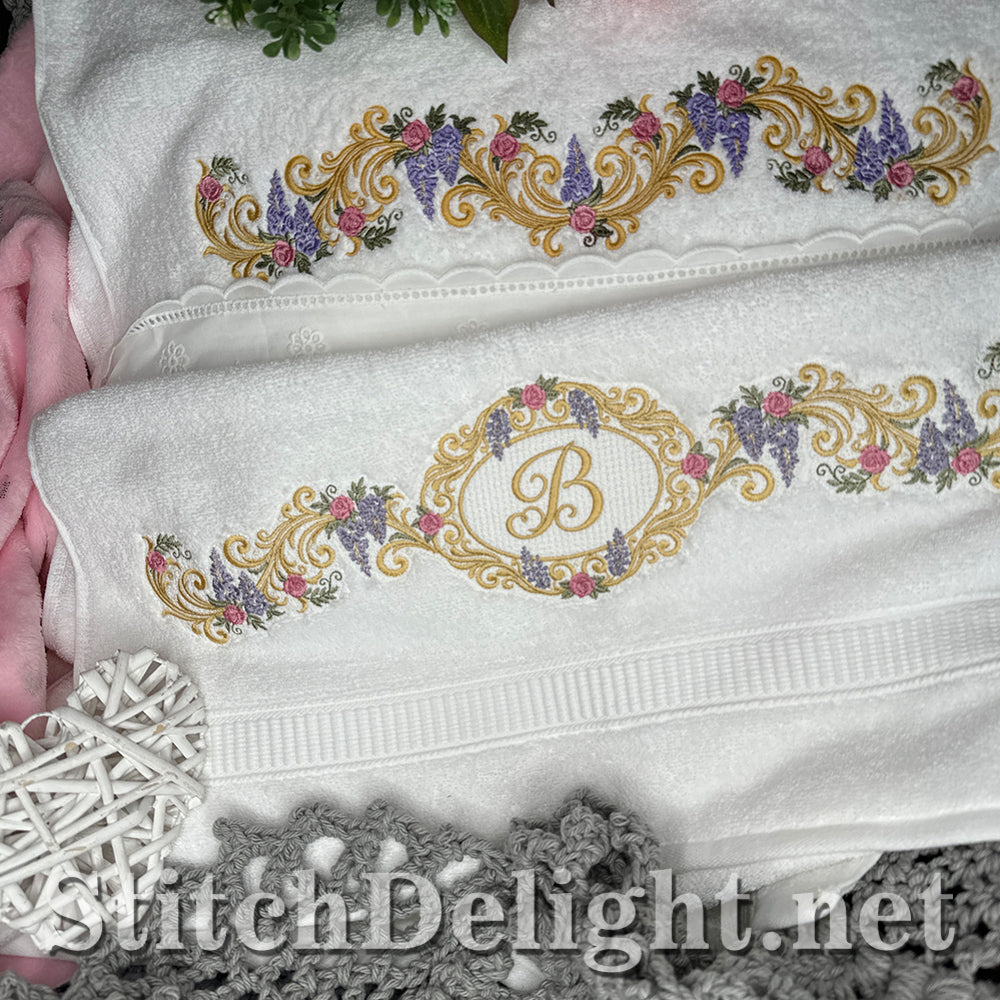Bridgerton Style borders for linen, towels, sheets, pillow cases, quilts or why not stitch one of the smaller ones on a bathrobe and matching on the bath slippers. A wide variety of sizes included and bonus designs all with knockdown stitch for stitching on to towels or bathrobes.