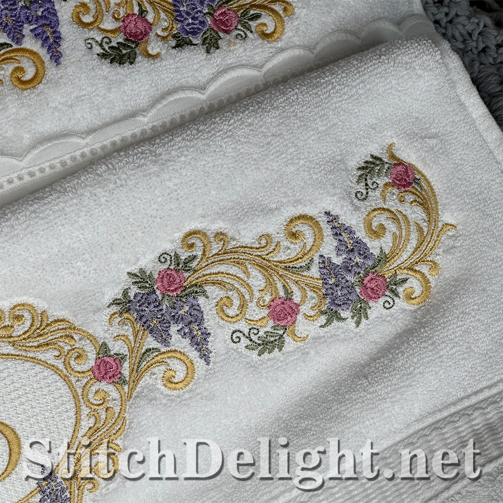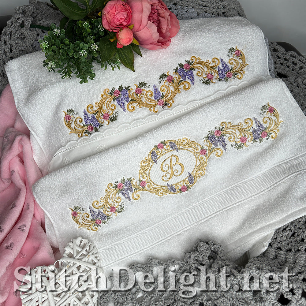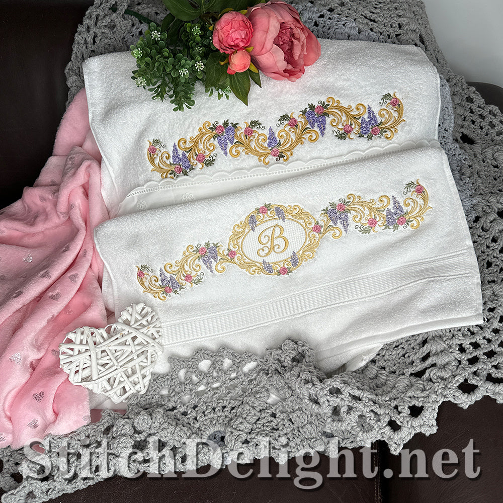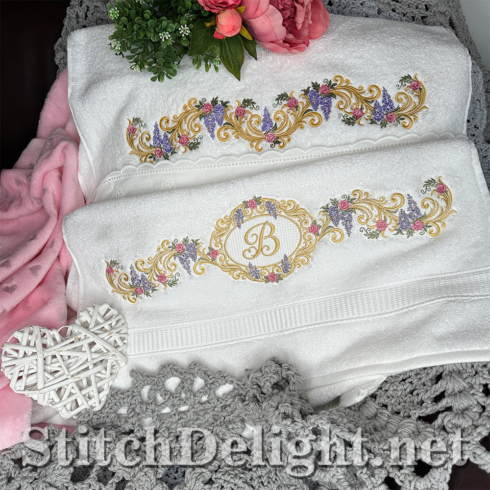 Bridgerton Style borders for linen, towels, sheets, pillow cases, quilts or why not stitch one of the smaller ones on a bathrobe and matching on the bath slippers. A wide variety of sizes included and bonus designs all with knockdown stitch for stitching on to towels or bathrobes.
