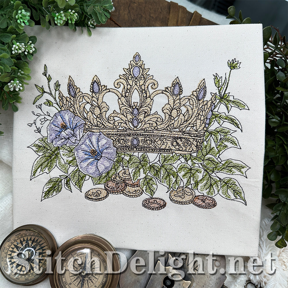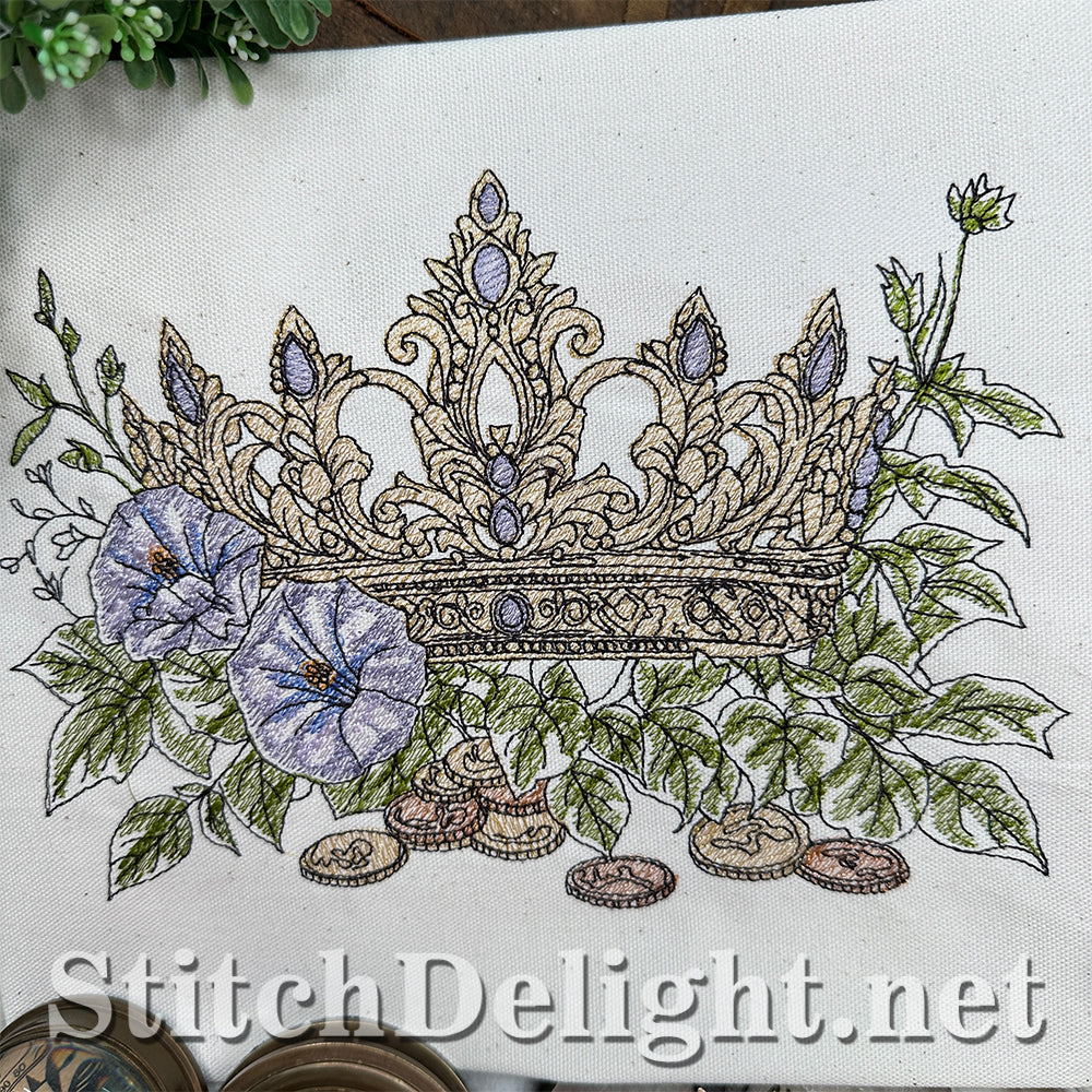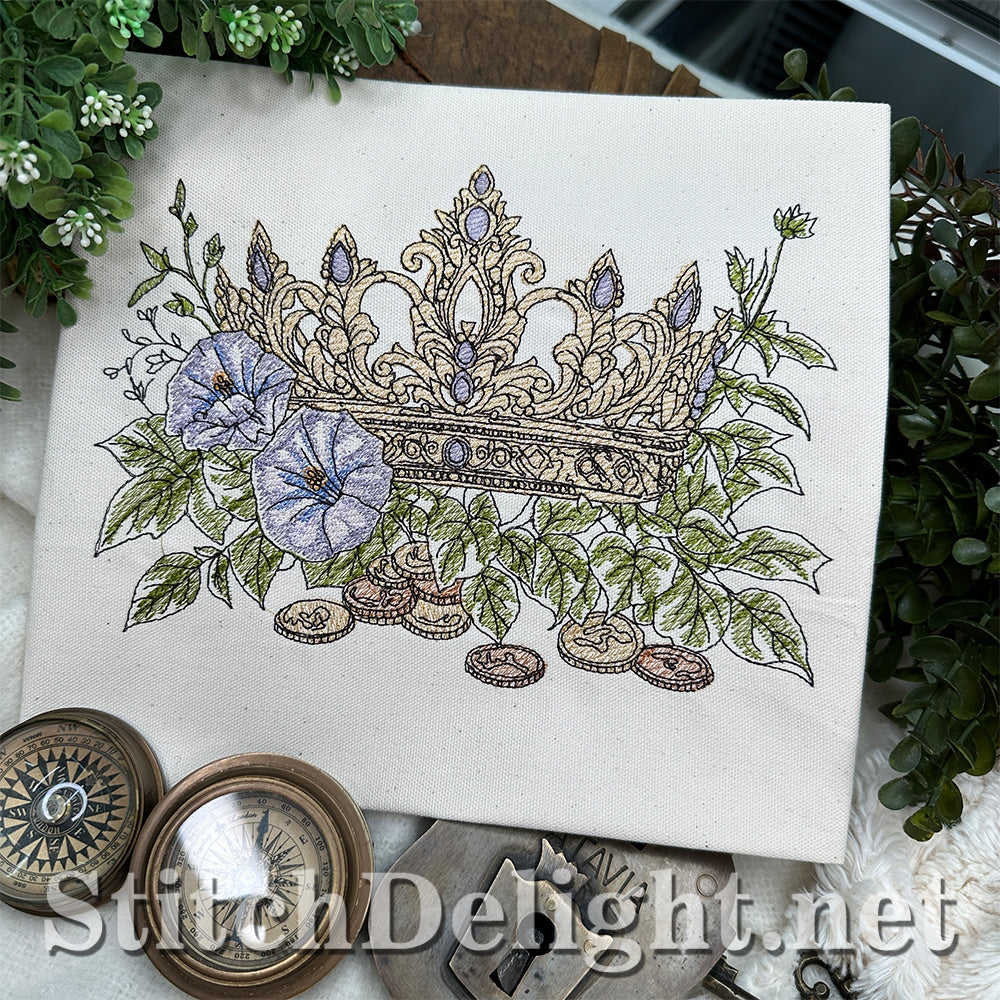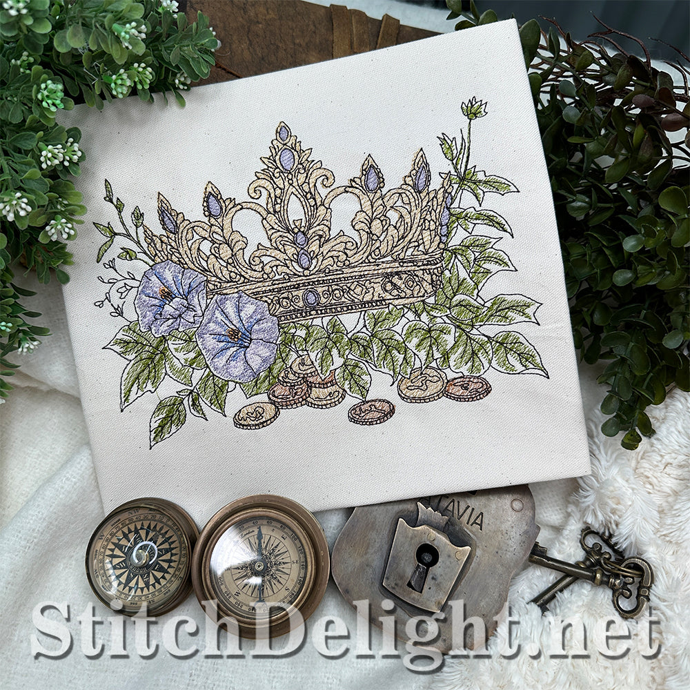 Embark on a fun treasure hunt with us. With gold and copper coins (yes we stitch these in metallic thread) and glorious morning glory vines, in a vintage and adventurous setting.