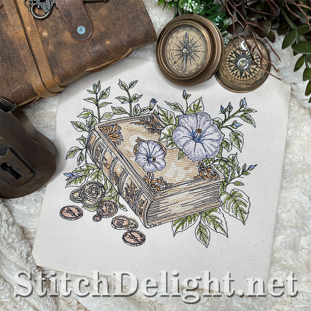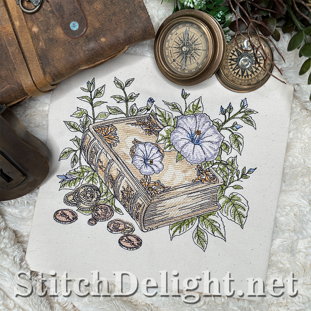Embark on a fun treasure hunt with us. With gold and copper coins (yes we stitch these in metallic thread) and glorious morning glory vines, in a vintage and adventurous setting.