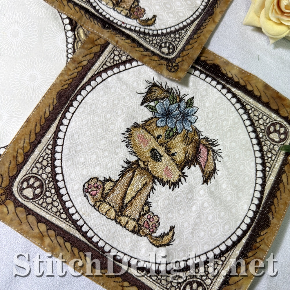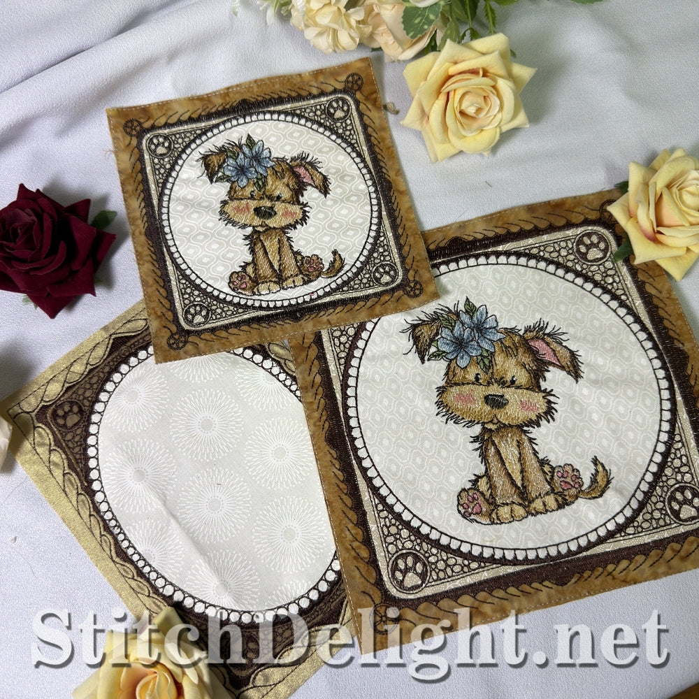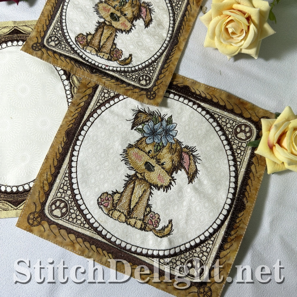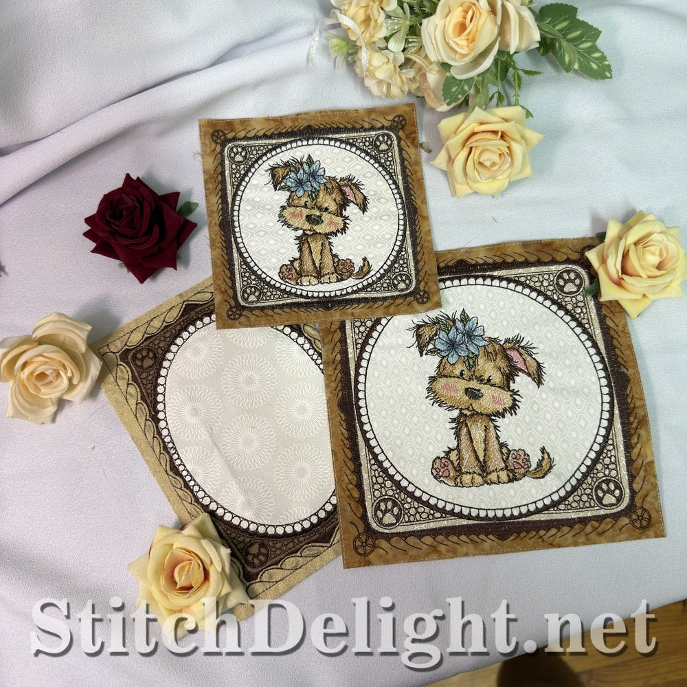 Each hoop size includes a full puppy quilt block and a coordinating blank quilt block.