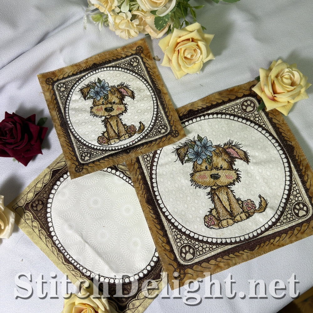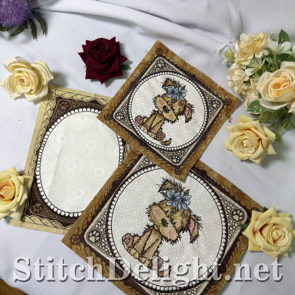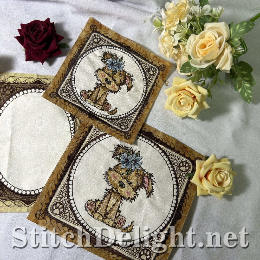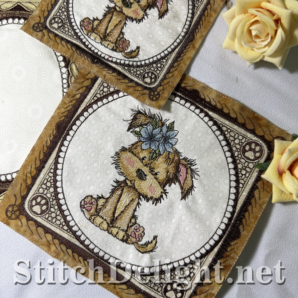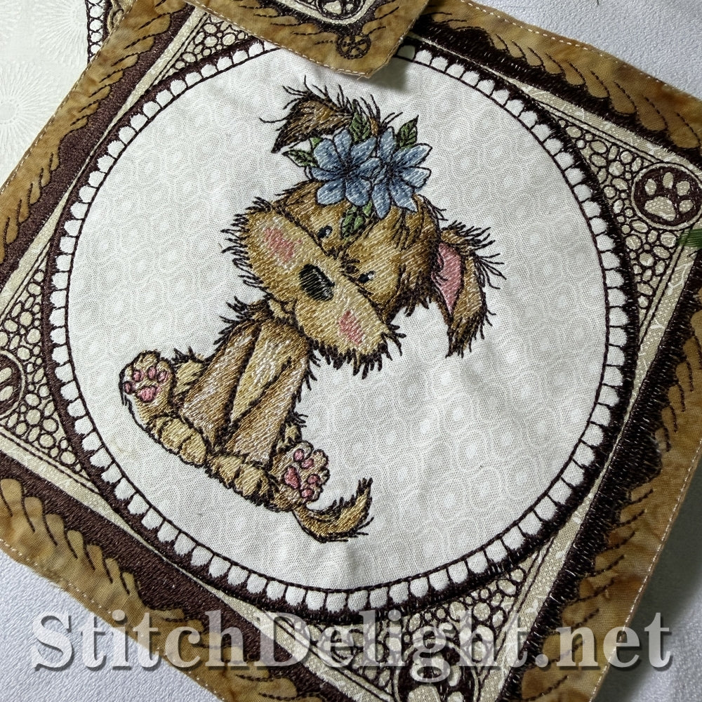 Each hoop size includes a full puppy quilt block and a coordinating blank quilt block.