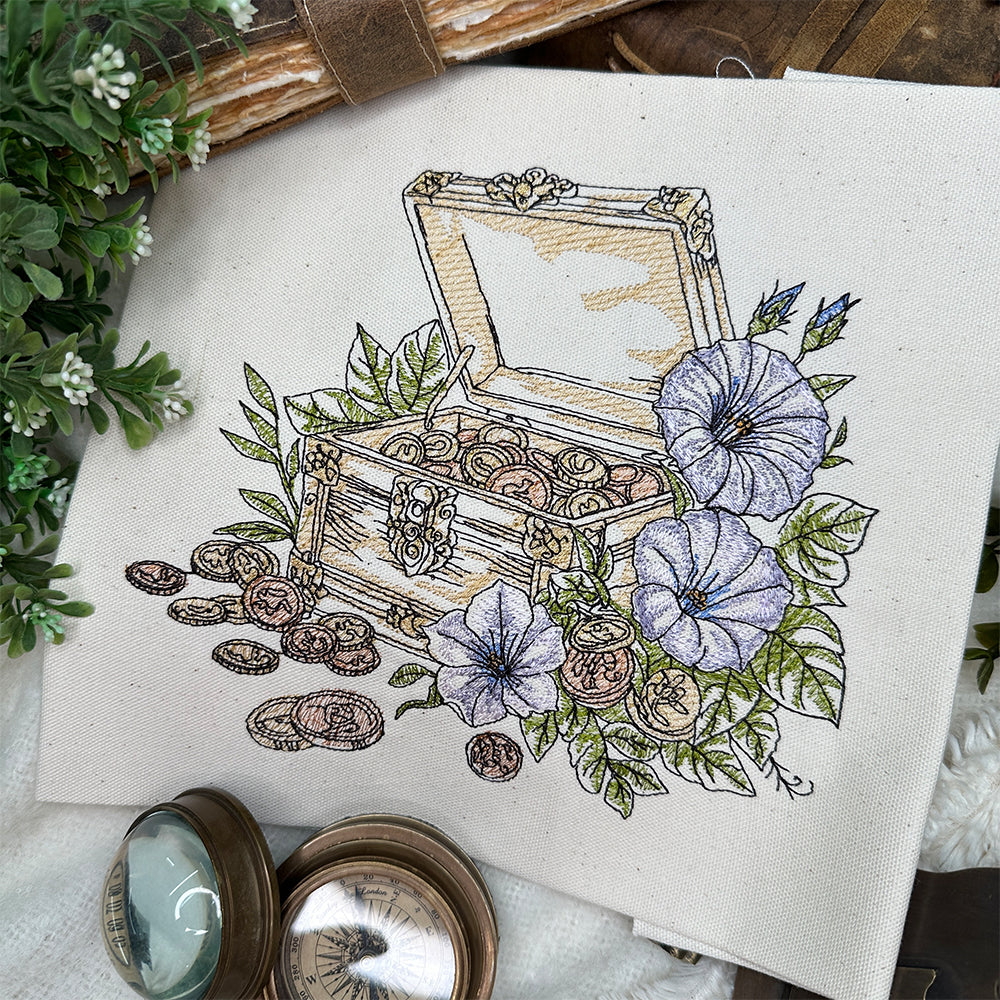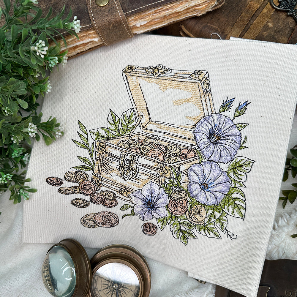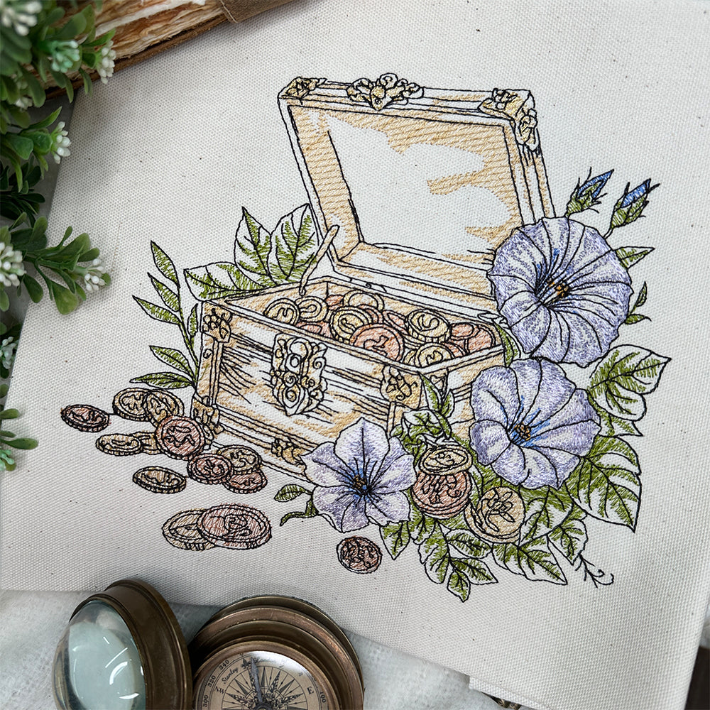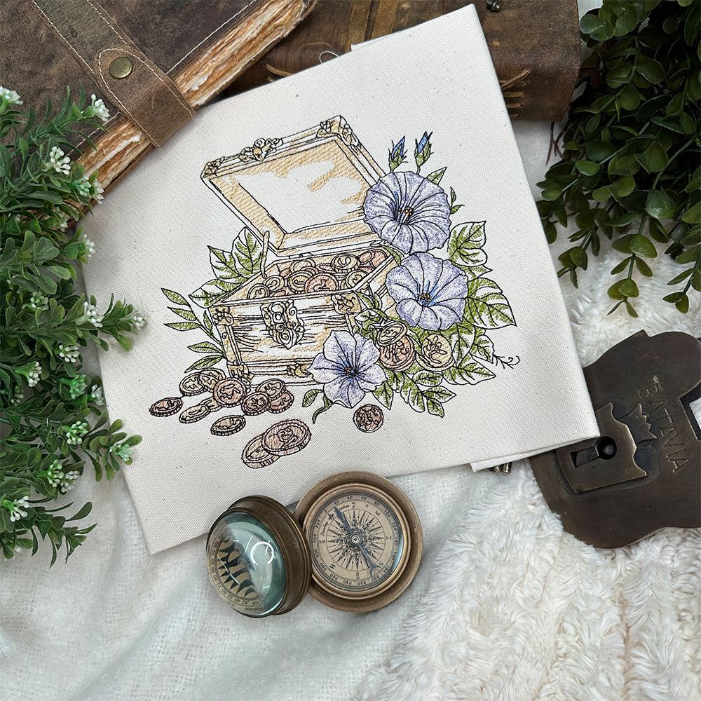 Embark on a fun treasure hunt with us. With gold and copper coins (yes we stitch these in metallic thread) and glorious morning glory vines, in a vintage and adventurous setting.