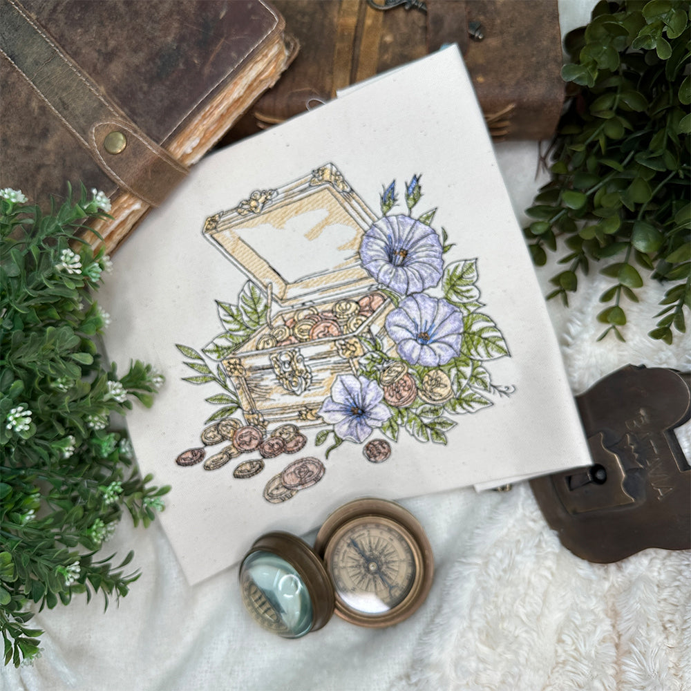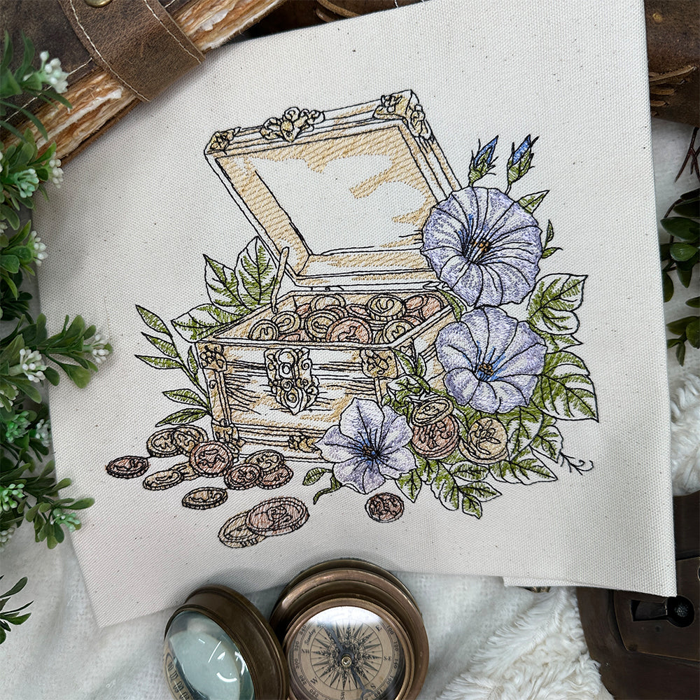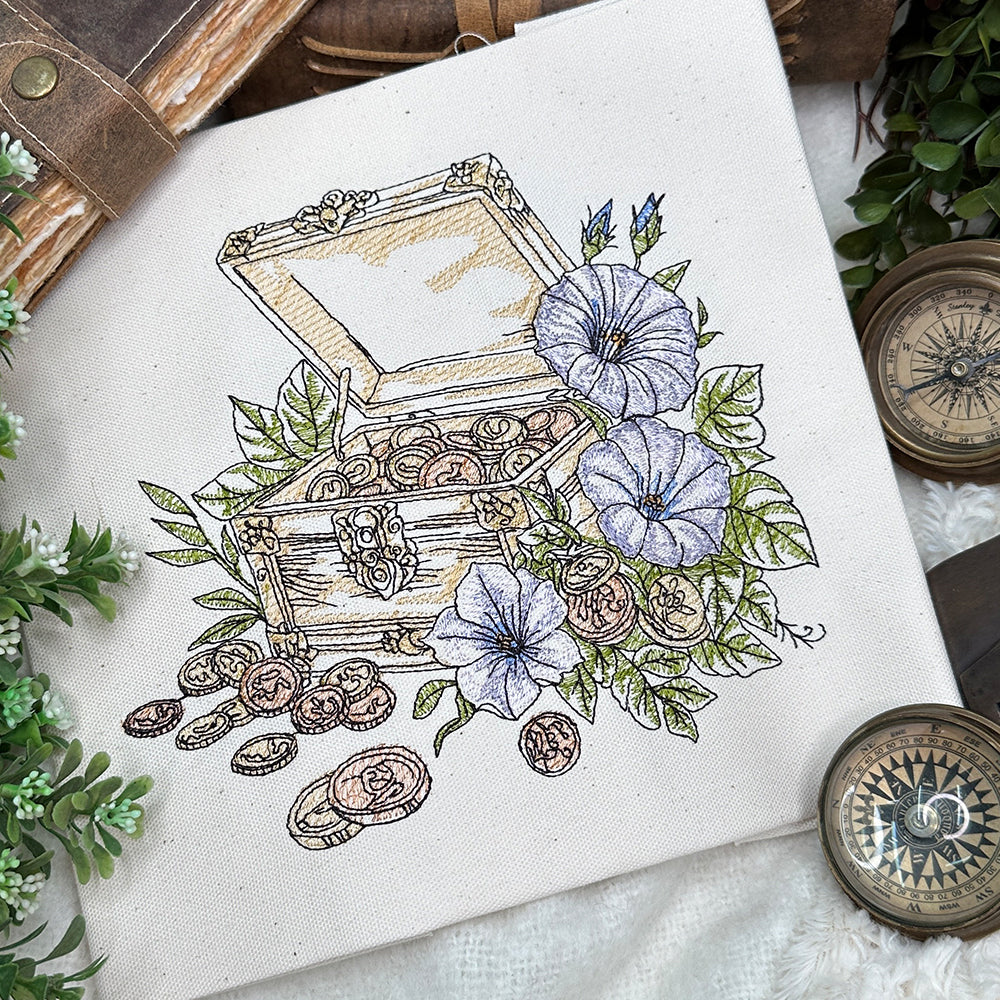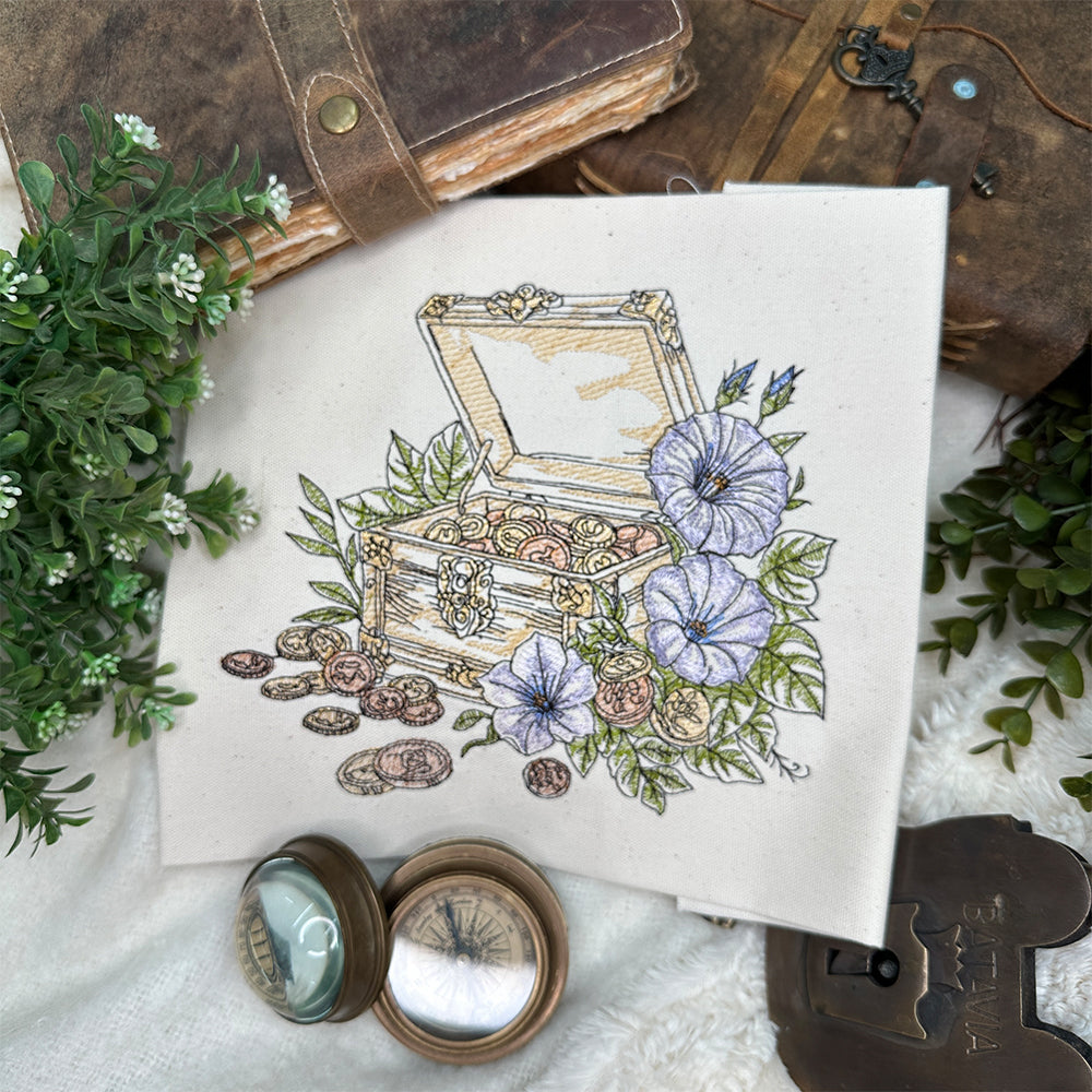 Embark on a fun treasure hunt with us. With gold and copper coins (yes we stitch these in metallic thread) and glorious morning glory vines, in a vintage and adventurous setting.
